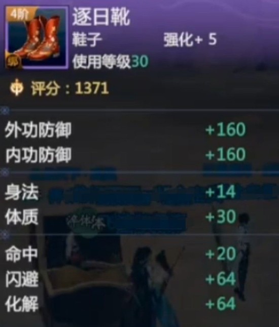 在基础属性方面,剑侠情缘零逐日靴可以提供内功防御和外功防御,最高数值可以达到160点。这件装备还能增加身法属性,基础加成为14点,经过强化后最高可以达到30点。此外还能提供24点命中和64点闪避,整体属性加成都相当出色。