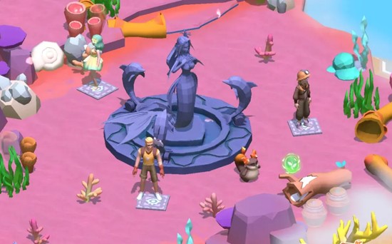 来到地图中的雕像附近,可以看到三个不同颜色的站位。要激活第四个彩蛋,必须由三名玩家分别站在对应颜色的位置上同时互动。这意味着单人游玩时无法独立完成,需提前组队或邀请好友协助。这一设计增强了珍珠海大冒险的社交互动性,也是目前该区域唯一需要多人配合才能触发的彩蛋。