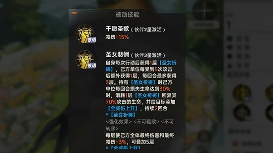 伊丽莎白的核心机制围绕“圣女祈祷”展开,该效果最多可叠加五层,仅她本人持有。每一层都能为全体友军提供增伤与减伤,层数越高整体收益越明显。当队友在单回合内生命值损失达到一定比例,且伊丽莎白已达到三星时,可消耗一层圣女祈祷为其恢复生命,并附加全减伤提升的特殊状态,大幅增强目标的抗打击能力。这一机制使得她在高压战斗场景下具备极强的救场能力,是龙族卡塞尔之门中少见的兼具治疗与防御强化的辅助型角色。