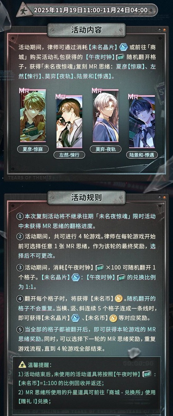 未定事件簿「未名夜惊魂」活动11月19日限时复刻~活动期间,律师可通过消耗【未名晶片】或前往「商城」购买活动礼包获得的【午夜时钟】随机翻开格子,获得「未名夜惊魂」复刻MR思绪:夏彦【惊寐】、左然【悚行】、莫弈【夜轨】、陆景和【悸遇】,一起来和小编看看吧~