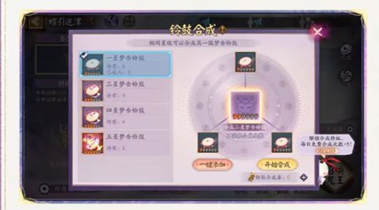 通过铃鼓合成功能,可将低星梦告铃鼓合成高星,大人可免费且不限次数地将1星合成2星。免费获取:纸舞新皮肤「幕怜花月」、SSR/SP式神召唤券、超鬼王华丽礼盒、御行达摩、动态头像框和插画等。