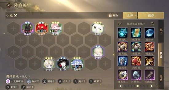 开局有寒小侠在考虑,或者两张一费小宠来的特别多在玩,这样才能尽早开出5宠物,5宠的璇玑星坦度和伤害对比三宠都是质变。3-1,3-2至少要保证小宠一二费全二再升级。波波桃因为承伤砍了,输出能力下降很多。需要配合璇玑星共通打伤害了。小宠需要8级找到血河小狗才能升级。因为阵容强度一大半都在璇玑星上。装备推荐波波桃带半肉吸血装,后排输出