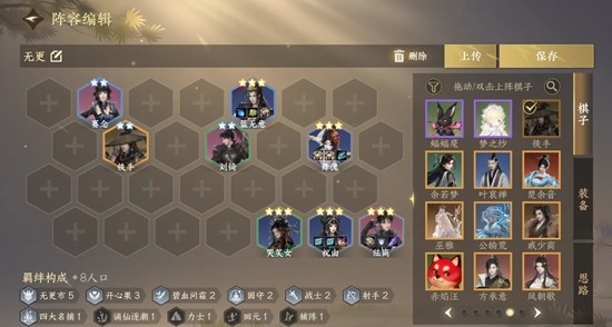 推荐舞魁来的比较多有转职的时候再考虑玩,无更现在2阶段过渡比较难受,所以刚需三星舞魁比较早,最好3-1能三星舞魁 ,保证三阶段节奏。祝由和苦笑女谁三谁带装备,也可以养三星陆离。装备推荐舞魁最好有一件苍月琬和傲雪铠,如果陆离主C,最好有一个御风镯。祝由和苦笑女主C,需要一件回蓝装加两件输出装。如果后期打御剑可以上一个二星赛念针对一下。可作为备选阵容推荐。