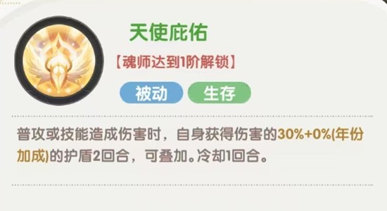 作为千仞雪的核心生存技能,“天使庇佑”可在她受到普攻或技能伤害后,立即生成一个基于所受伤害30%加上年份加成数值的护盾,持续两回合且可叠加。该技能冷却时间短,配合回合制机制可频繁触发。当此技能突破至10万年品质时,千仞雪还能额外获得40%格挡率,极大提升其在前排的站场能力,成为队伍中可靠的抗伤核心。