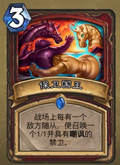 答:战士的职业新卡——保卫国王,战场上每有一个地方随从,便召唤一个1/1并具有嘲讽的禁卫。
