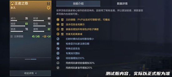 除此之外,王者之尊还提供了常规的加成技能,如“装备后增加所有背包步枪子弹数”以及经验金币加成,这些技能进一步提升了玩家的战斗效率和收益。