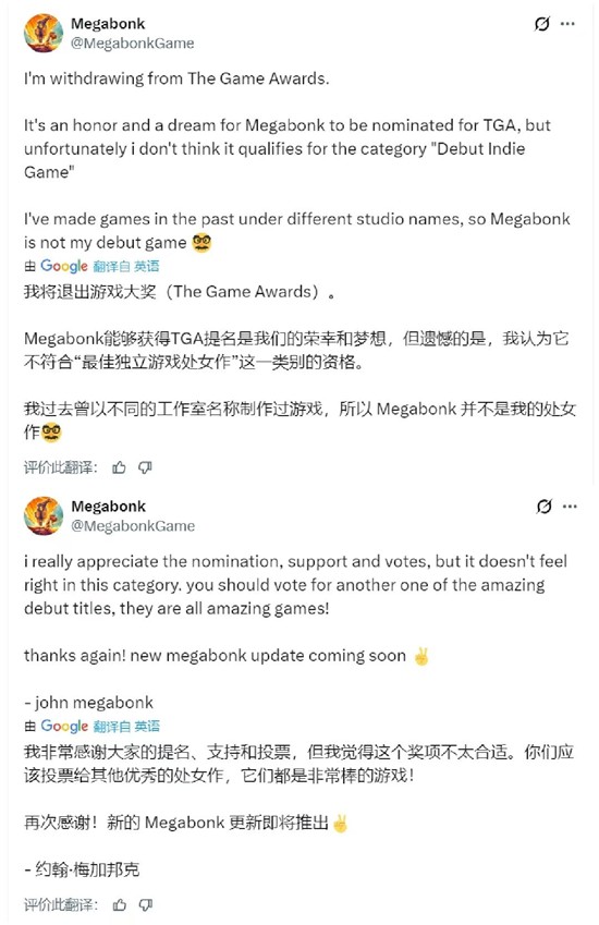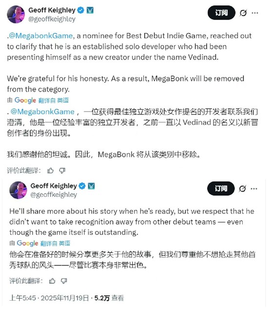 Keighley提到,开发者之前一直以新人创作者Vedinad的身份出现,他们对开发者的诚实表示感谢。根据评审规则,《Megabonk》将不再参与最佳处女作奖项的评选。