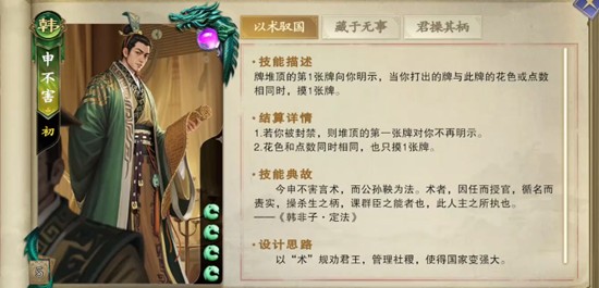 申不害是一名信息控制型武将,擅长为团队提供视野与预判优势。其一技能可预知下一张抽牌内容,若打出的牌与预测花色一致,则可额外摸一张牌并继续行动,提升了出牌连贯性与资源利用率。二技能每局限用一次,当其成为杀牌或战法牌目标时,可强制公开该敌人所有手牌直至回合结束,彻底暴露对手策略意图。这一效果在组队模式中极具战略价值,能帮助队伍提前布局应对,是高端对局中不可或缺的情报核心。