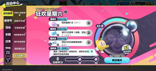 蛋仔派对疯狂星期六活动周期通常为每周六至周日开放,最近一次为2025年11月10日至11月16日。在活动期间,玩家只要于周末登录游戏,即可领取基础奖励,包含一定数量的彩虹币,周末登录奖励还会享受双倍加成。此外,完成两次任意模式的游戏对局(如经典模式或当期活动模式),即可完成当日任务目标,获得额外福利。