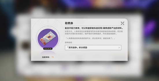 使用助燃卷时需注意,该道具并不能替代体力消耗。每次使用助燃卷刷取拟造花萼仍需消耗10点体力,刷取凝滞虚影则需30点体力。也就是说,即使拥有足够的助燃卷,若体力不足也无法进行快速刷取。此外,使用助燃卷完成副本后,所消耗的体力可以计入每日任务中的“消耗120体力”目标,但无法完成需要实际战斗行为的任务,例如击败指定数量敌人或触发弱点击破等机制。
