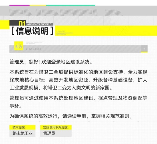 明日方舟:终末地游戏中玩家将成为终末地工业的管理员,率领您的干员们,保卫、拓展人类的边疆。探索塔卫二,收集资源,利用集成工业系统攻克险境,管理员可通过本系统处理地区建设、据点管理及物资调配等事务。为确保系统高效运行,请通读手册,掌握相关规范准则。