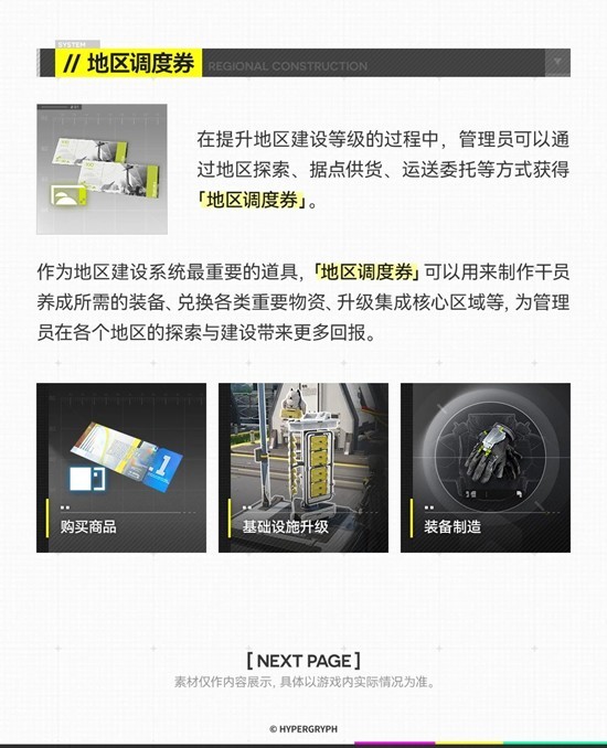 作为地区建设系统最重要的道具,「地区调度券」可以用来制作干员养成所需的装备、兑换各类重要物资、升级集成核心区域等,为管理员在各个地区的探索与建设带来更多回报。