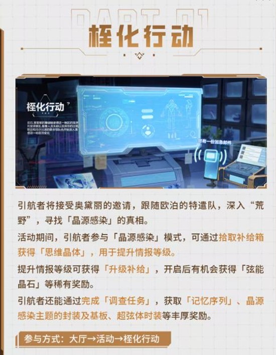 在桎化行动中,玩家将接受奥黛丽的邀请,跟随欧泊的特遣队深入荒野,寻找晶源感染的真相。通过参与晶源感染模式,玩家可以通过拾取补给箱获得思维晶体,用于提升情报等级。提升情报等级可获得升级补给,开启后有机会获得弦能晶石等稀有奖励。此外,完成调查任务还能获取记忆序列、晶源感染主题的封装及基板、超弦体时装等丰厚奖励。