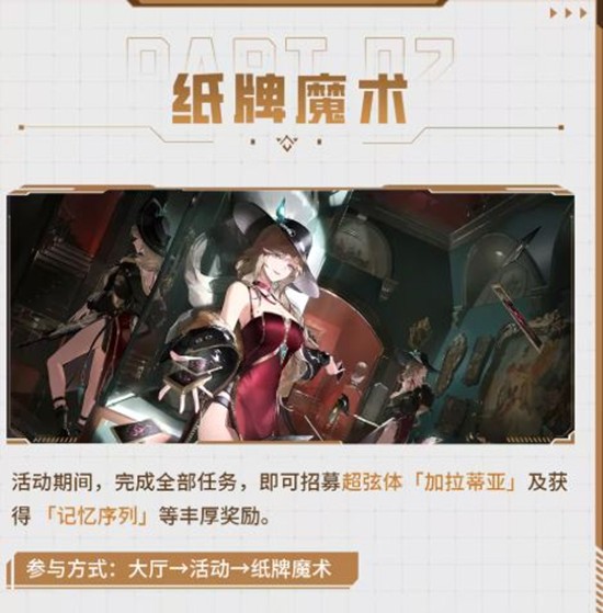 完成全部任务后,玩家即可招募超弦体「加拉蒂亚」并获得记忆序列等丰厚奖励。参与方式为大厅→活动→纸牌魔术。