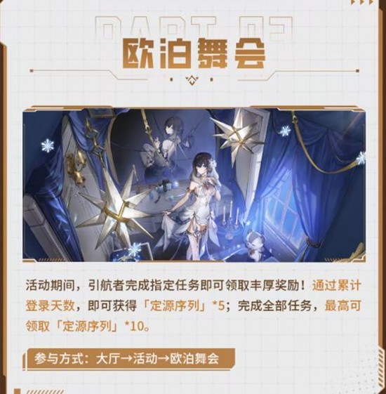 活动期间,玩家完成指定任务即可领取丰厚奖励!通过累计登录天数,即可获得定源序列5;完成全部任务,最高可领取定源序列10。参与方式为大厅→活动→欧泊舞会。