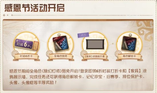 活动内容:感恩节期间,全角色(除幻灯师)限免开启,玩家登录游戏即领6折时装打折卡和【家具】涂鸦展示墙,完成任务还可获得角色解锁卡、记忆珍宝·旧赛季、排位保护卡、头像、头像框等丰厚奖励。