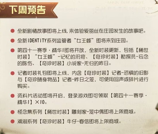 全新剧情故事即将上线,新监管者“七王蜂”即将来到庄园。