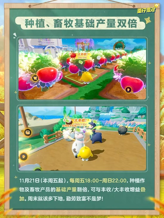 蛋仔派对从11月21日(本周五)起,蛋仔农场将开启周末狂欢活动,活动期间,种植、畜牧的基础产出将翻倍,鱼缸产出的农场币和鱼饵产出速度也将翻倍。此外,玩家还可以额外获得1个加工厂订单。