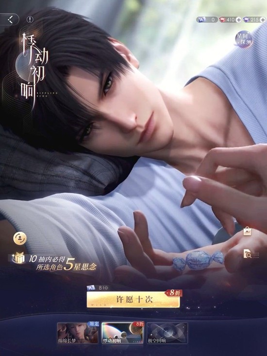 当游戏开启活动时,玩家需要在活动界面进行限时卡面的抽取。每个许愿池中五星卡的概率均为1%,游戏内设有保底机制,新手8折抽卡结束后,每70抽会保底获得一张男主卡面。