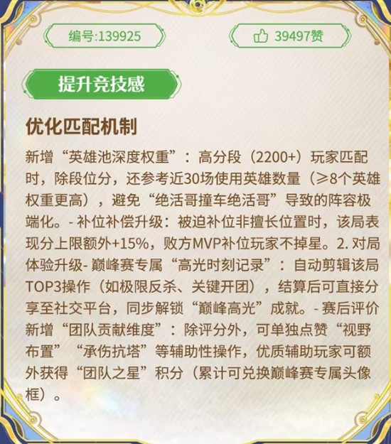 优化匹配机制:新增“英雄池深度权重”和“补位补偿升级”等。