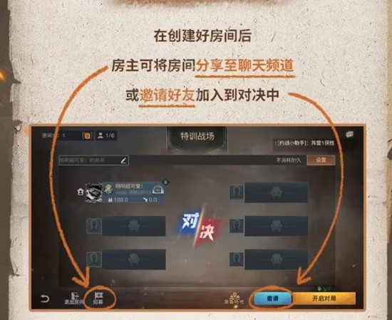 创建好房间后,房主可以将房间分享至聊天频道或邀请好友加入对决中。