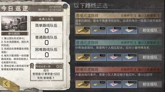 巡逻路线分为简单、普通和困难三个档次,最少人数要求分别是1人、2人和4人。