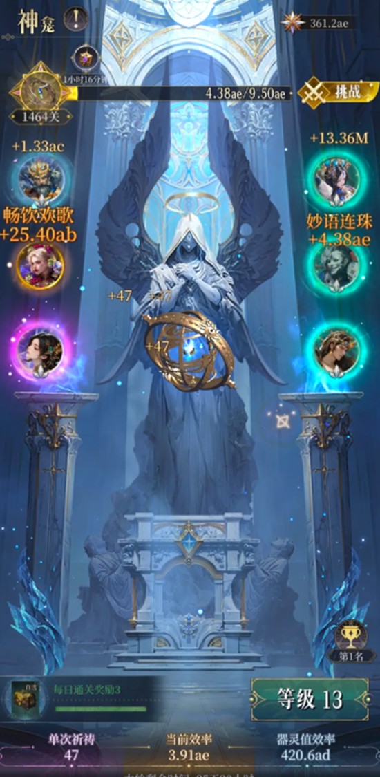神龛内提供的装备能显著提升队伍整体战力,且装备等级受限于当前所达到的主线章节,越早推进关卡,越能获取高等级装备支持。此外,神龛还包含每日三次自动祷告的功能,完成祷告后可领取资源奖励。当资源充裕时,还能手动提升祷告等级以获取更多收益。这一系统与主线进程相辅相成,建议玩家保持稳定的推图节奏,以便持续获得成长所需物资。