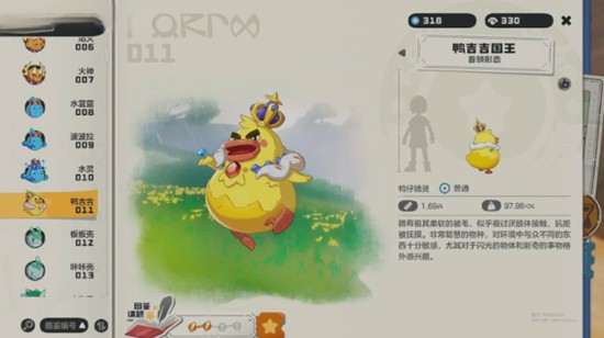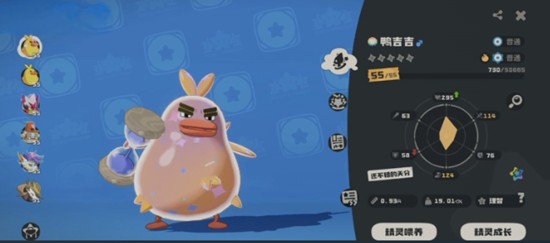 鸭吉吉的基础形态是玩家最早接触的版本,体型小巧,头部略显扁平,整体充满活力感。这一形态的鸭吉吉性格活泼,行动敏捷,是初期队伍中的常见成员。虽然战斗力不算突出,但其亲和力十足的外观让许多玩家愿意将其带在身边培养。随着亲密度和等级的提升,它会逐步解锁后续形态,开启更多成长可能性。这一阶段的鸭吉吉虽未展露全部潜力,却是后续进化的必要基础。