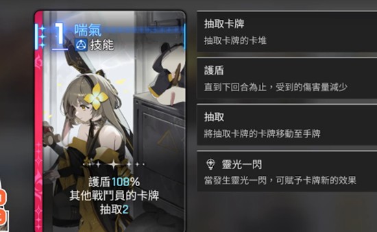 通过灵光一闪获取的卡牌也为维若妮卡提供了多样选择。例如喘气这张卡,仅需一费即可提供100%护盾并抽取两名战斗员的手牌,在高速与低速卡组中均有出色表现,尤其擅长抓取关键功能牌。灵光一闪的三个衍生形态中,衍生一应用最广,侧重资源调度;衍生二偏向输出强化;而衍生三为零费上盾,虽生效不稳定,但在特定场合仍有战术价值。