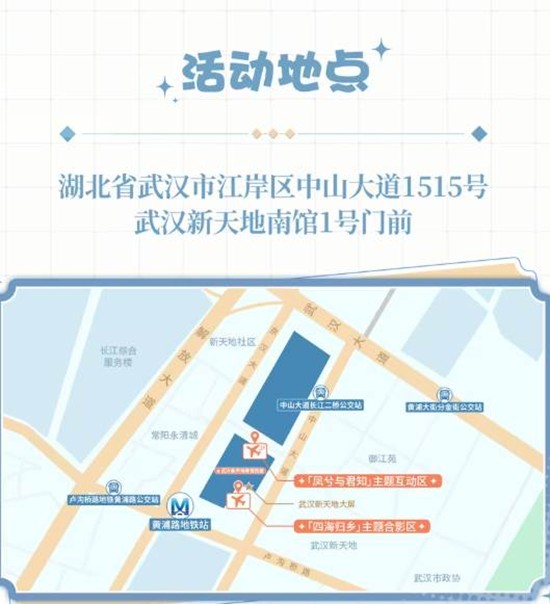 活动地点湖北省武汉市江岸区中山大道1515号武汉新天地南馆1号门前。