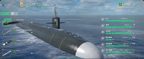 在潜艇选择方面,俄亥俄级是现代战舰中综合性能较强的攻击型潜艇。拥有五个导弹槽,玩家可根据战术需求灵活配置武器。其潜航速度快,操控灵活,适合执行突袭与骚扰任务。静音效果优秀,能有效规避敌方声呐探测,便于隐蔽接近目标。但需注意其氧气储备有限,下潜时间需合理规划。在战斗中可利用导弹进行远程消耗,配合队友吸引火力,发挥关键补刀作用。