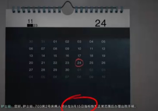 在进入七日世界医院迷宫后,首先要注意观察周围环境。墙面上挂着一个日历,上面显示的日期为11月24日。这个日期是解开七日世界医院迷宫的关键线索之一。与此同时,在左侧可以发现一部电话,与之交互后会有护士传来声音,提示你不能离开医院,因为你的出院时间是9月15日。这说明当前日历显示的时间与目标时间不符,必须进行调整才能离开。