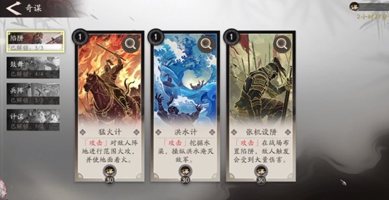 奇谋的培养主要分为两个方向:一是通过正合之书提升全体奇谋的基础等级,二是针对特定奇谋进行专项强化。使用正合之基础材料和百钱可提升正合之书等级,从而增强所有奇谋的基础攻击力。而具体奇谋的强化则需消耗奇胜法和天地无穷等稀有资源,用于提升单个奇谋的技能强度与附加效果。随着等级提升,奇谋的冷却时间也会相应缩短,释放频率更高,战场影响力随之增强。