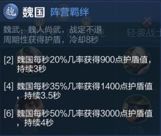 魏国羁绊以护盾保护为核心。两名魏国角色上阵即可激活基础效果,每秒有20%概率获得900点护盾。当六名魏国角色上场时,触发概率提升至50%,护盾值高达3000点且持续4秒,大幅增强前排抗伤能力。该羁绊在中后期团战中表现尤为突出,是构筑防御型阵容的重要选择。