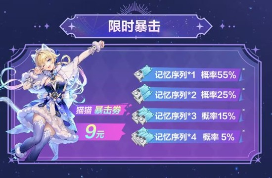 直播期间,玩家可以通过购买“猫猫暴击券”参与限时暴击活动,价格为9元。暴击券提供了不同数量的记忆序列,概率分别为:记忆序列*1,概率55%记忆序列*2,概率25%记忆序列*3,概率15%记忆序列*4,概率5%、