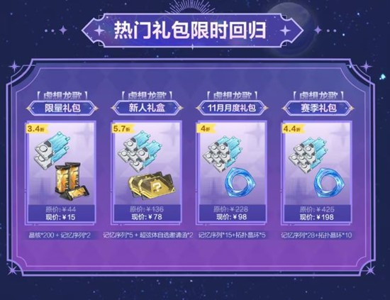 除了上述活动,还有晶核折扣礼包供玩家选择,包括:晶核冲刺1档:晶核200+记忆序列2,现价30元(原价44元)晶核冲刺2档:晶核980+晶核75+记忆序列*2,现价98元晶核冲刺3档:晶核1980+晶核180+记忆序列*3,现价198元、