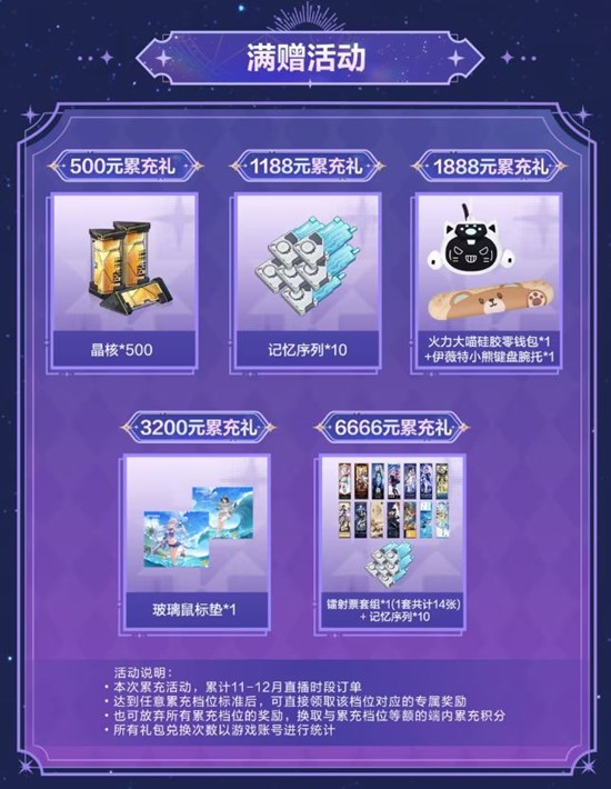 直播期间,玩家累计消费达到一定金额,即可获得额外的奖励:500元累充礼:晶核*5001188元累充礼:记忆序列*101888元累充礼:火力大嘴硅胶零钱包1+伊薇特小熊键盘腕托13200元累充礼:玻璃鼠标垫*16666元累充礼:镭射票套组1(1套共计14张)+记忆序列10、