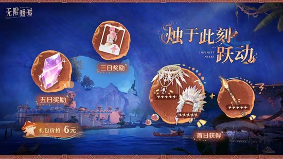 6元即可解锁【烛于此刻跃动】,根据累计登录天数自动开放对应奖励,包括帽子【繁茂的绒羽】、颈饰【飘动的祈求】、手持物【长夜不熄】、动作【星火流跃】、启示水晶*1及其他奖励。