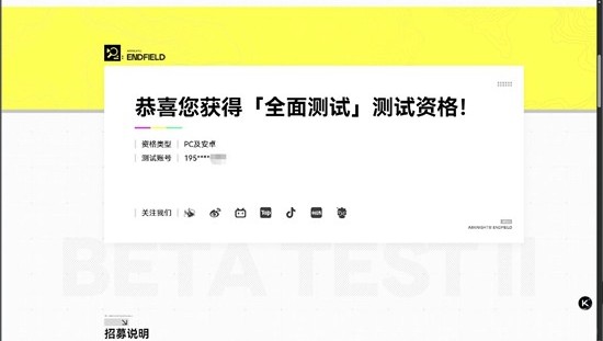 亲爱的管理员:《明日方舟:终末地》「全面测试」体验资格已开始陆续发放,管理员可通过以下途径确认是否获得体验资格: