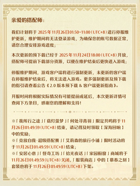 官方计划于2025年11月26日01:50至11:00(UTC+8)进行停服维护更新。为感谢搭配师们的耐心等待,维护结束后将向所有在12月3日23:59(UTC+8)前解锁邮箱功能并登录的玩家发放补偿奖励:钻石500、共鸣水晶1。