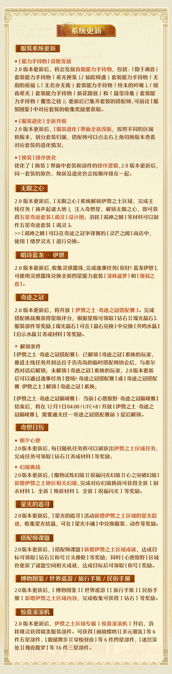 2.0版本最大的亮点是「祷声起诸大地」主线任务的永久开放。完成主线「群星守望的起点」后,搭配师可深入伊赞之土,探索全新的故事剧情,并获得钻石、养成材料等丰厚奖励。