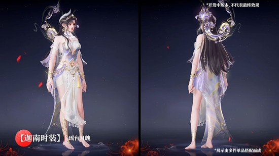 【瑶台月魄】时装的设计灵感来源于月夜的神秘与美丽,纯净的月白色调搭配暮色中的淡紫流光,仿佛将玩家带入一个充满诗意的月夜世界。时装的细节处理精致,星光闪烁的效果更是增添了一份神秘感,让人仿佛置身于瑶台之上,感受月魄的魅力。