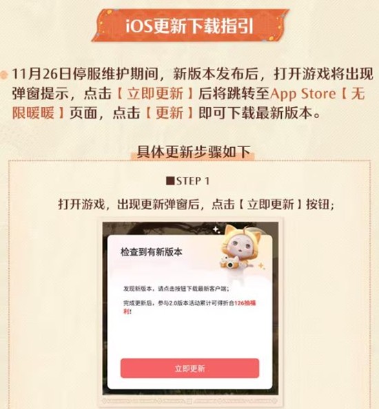 5.11月26日停服维护期间,打开游戏将出现弹窗提示,点击“立即更新”后将下载新版官方客户端。