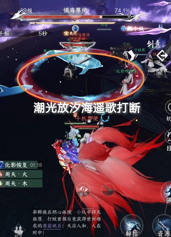 潮光盯着汐海,释放技能时马上用汐海遥歌打断,这个技能很痛,被碰到马上按解控远离。最后打镇海时只需注意镇海释放牵引技能时,按解控远离。