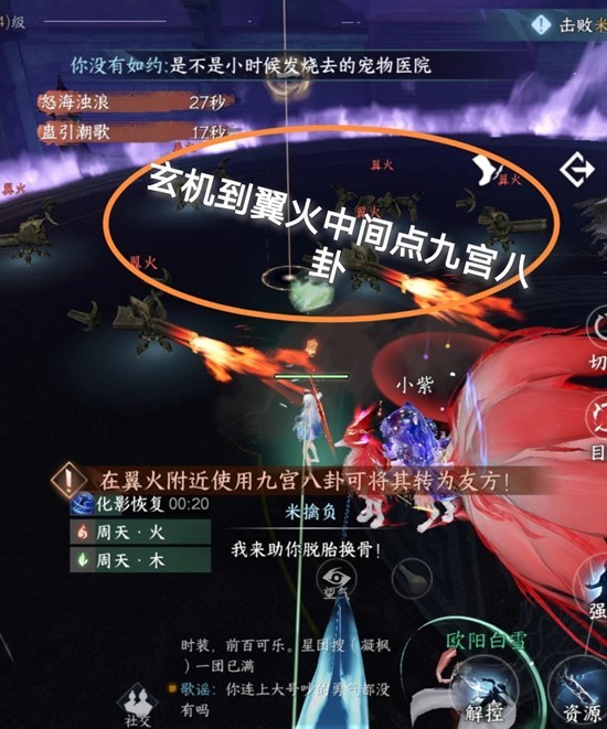 千机推荐远程站boss脚下打,因为千机会按顺时针顺序一直窜,站中间都能打到。被千机点名的开解控第一时间远离千机。出现翼火时玄机找翼火释放九宫八卦打的快不会出现翼火。
