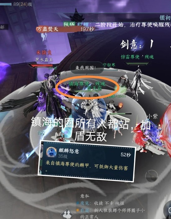 镇海出白圈的时候,所有人包括奶妈站圈获得盾buff,buff持续期间可以不躲伤害。惊雷身上出现传功标志的时候,靠近惊雷点传功,满之后继续集火boss。