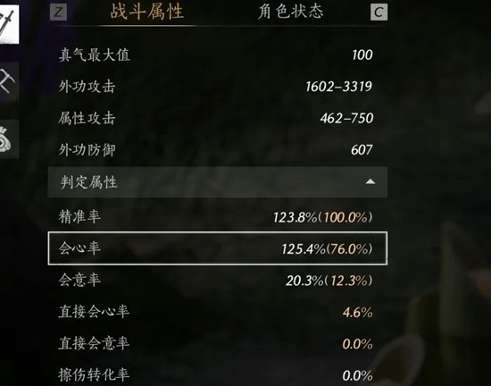 2、会心率和会意率要求:不计算断石的情况下,易水+扶摇是9.2%直接会心率,加上断石为13.3%直接会心率,现版本基础会意率(天赋点满)为11.2%,所以此时会心会意综合已经有20.4%和24.5%,满爆所需会心率为79.6%和75.5%。由于该流派武学心法有大量会心伤害加成,且输出占比大部分集中在4豆的那一拳上,所以要尽量避免那一拳出会意伤害,因此调律时最好一点会意都不要,最多最多能接受一条势(P1的会意其实是偏高了的)。会心率堆到满爆或者接近满爆即可。