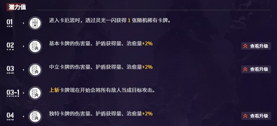 加点方面,优先提升独立卡牌等级,以增强伤害与动量获取,随后主点暴击率,最后补全发射上斩技能。该技能材料需求不高,提前点出可显著提升群攻能力。主动技能增伤与减伤效果尚可,EP消耗低,适合频繁释放。五星泽塔的本能属性增伤与天上词条契合度高,被视为卡利佩的专武级角色,其主动技能可稳定抽取高费卡,实现类似突发射的定向调度,极大优化出牌节奏。