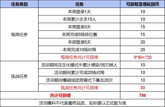 任务共分为每周任务和挑战任务,活动时间共47天,共计8个自然周,共计可获得750枚至尊轮回币。每周任务多为登录任务与对局任务,将每周任务全部做完共计可获取720枚至尊轮回币,仅将每周任务全部完成便可将奖池中的所有奖励全部收入囊中。挑战任务的难度也并不高,共计可获取30枚至尊轮回币。