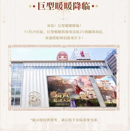 11月29日起,巨型暖暖将现身百联ZX创趣场顶层,为搭配师们带来前所未有的视觉冲击和互动体验。